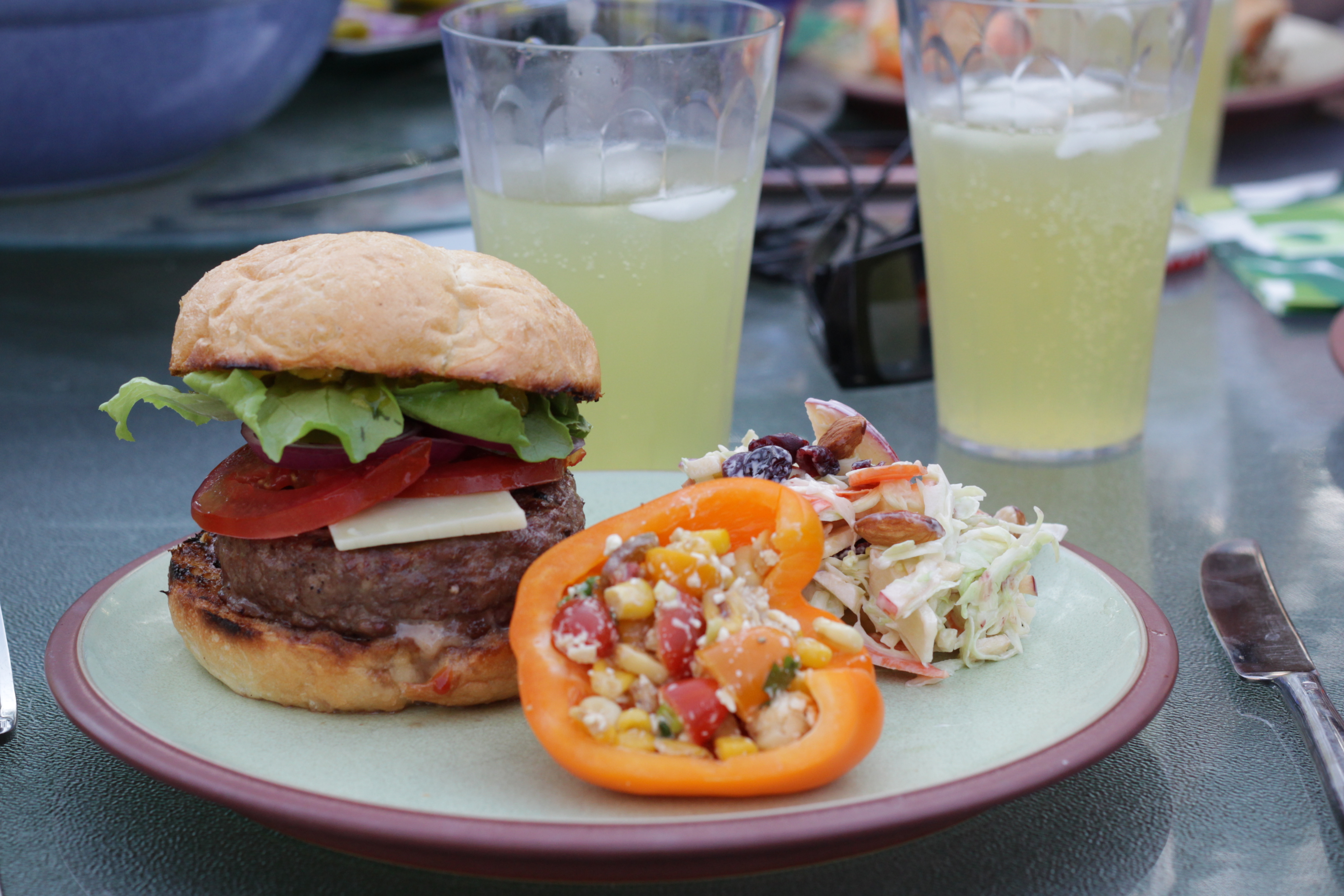Main: Packwoods Brie, Onion, and Sundried Tomato Stuffed Burgers, Stuffed Pepper Salad, and Apple Cranberry coleslaw. Beer Stuffed Margarita (Mexican Bulldog)